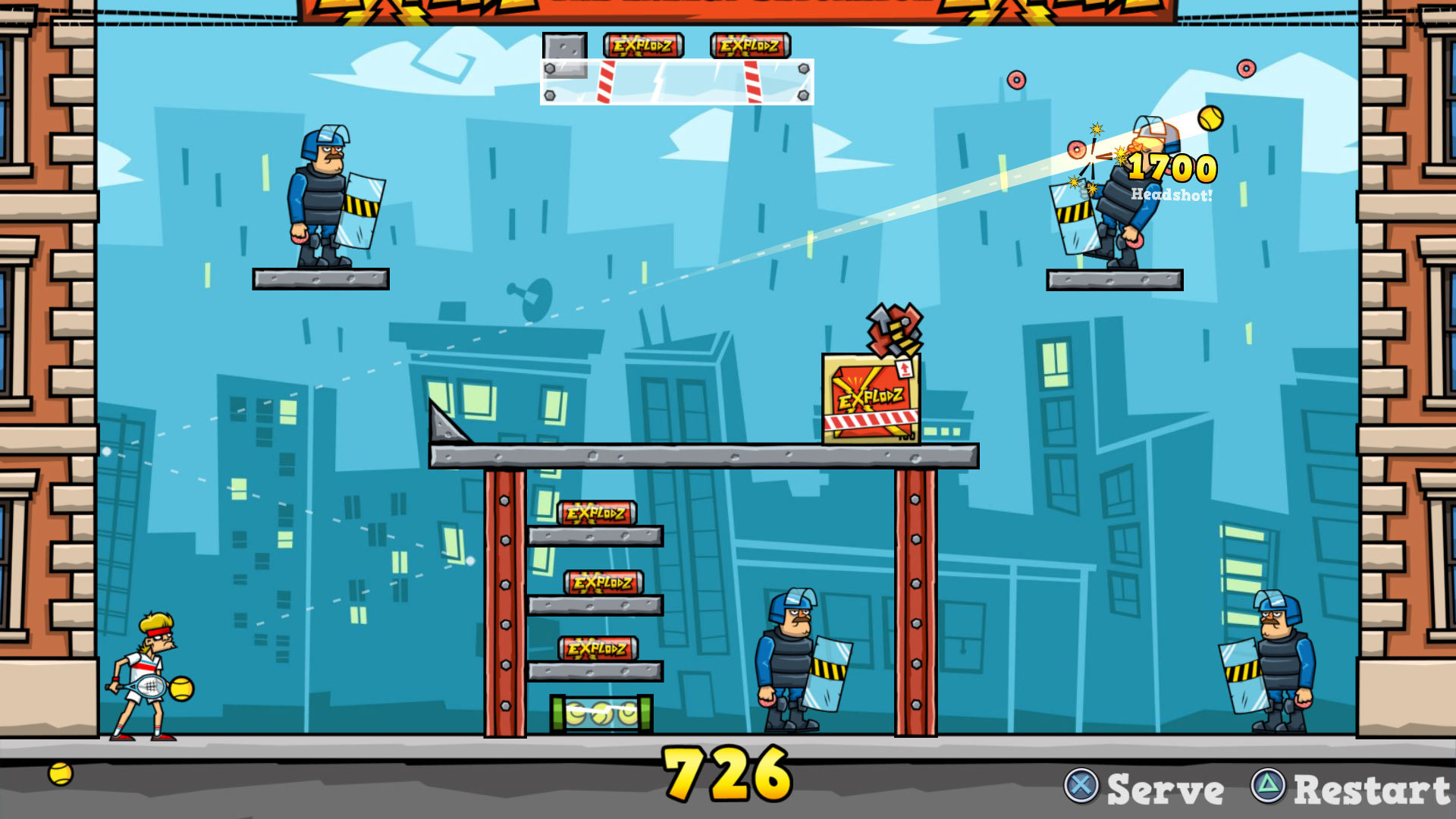 Conceptually and graphically, I really enjoyed Tennis in the Face. I thought the cartoonish nature worked fantastic for this satirical and frankly absurd concept, and it wouldn’t have been as fun had the people been more realistic or had the tone been darker. There’s no questions as to why everyone hangs out in construction zones and such, or why angles seem to magically exist, or why someone falling on their friend is just as effective as getting a tennis ball straight to the face. In fact, the cartoonish approach makes it even better, as King Oddball felt a little dark in some instances (since all the enemies were tanks and military). Having this just be the most over-the-top way for someone to deal with tennis related frustration makes it work that much better for me.