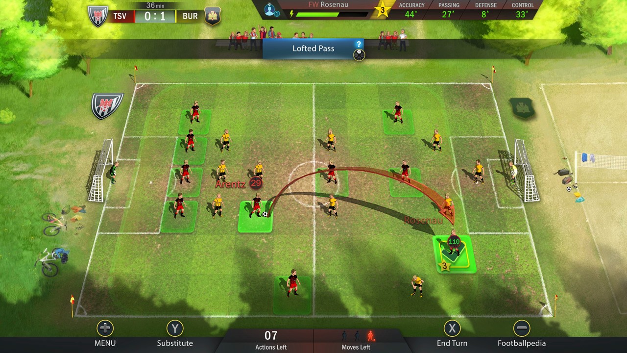 Football, Tactics & Glory is a turn-based football simulation. Imagine a much simplified Football Manager game when you pick the team, make transfers and organise training and mix that with something that looks like a turn based Sensible Soccer. Football, Tactics & Glory doesn’t have any official licenses, but that doesn’t make it any less interesting or fun. At the beginning Football, Tactics & Glory throws you straight into a game, something reminiscent of EA titles, it’s works quite well introducing you to some of the simpler interactions required to progress. There’s actually a bit of a plot opener, as you get injured in the game and then that starts you off on your career as a manager.