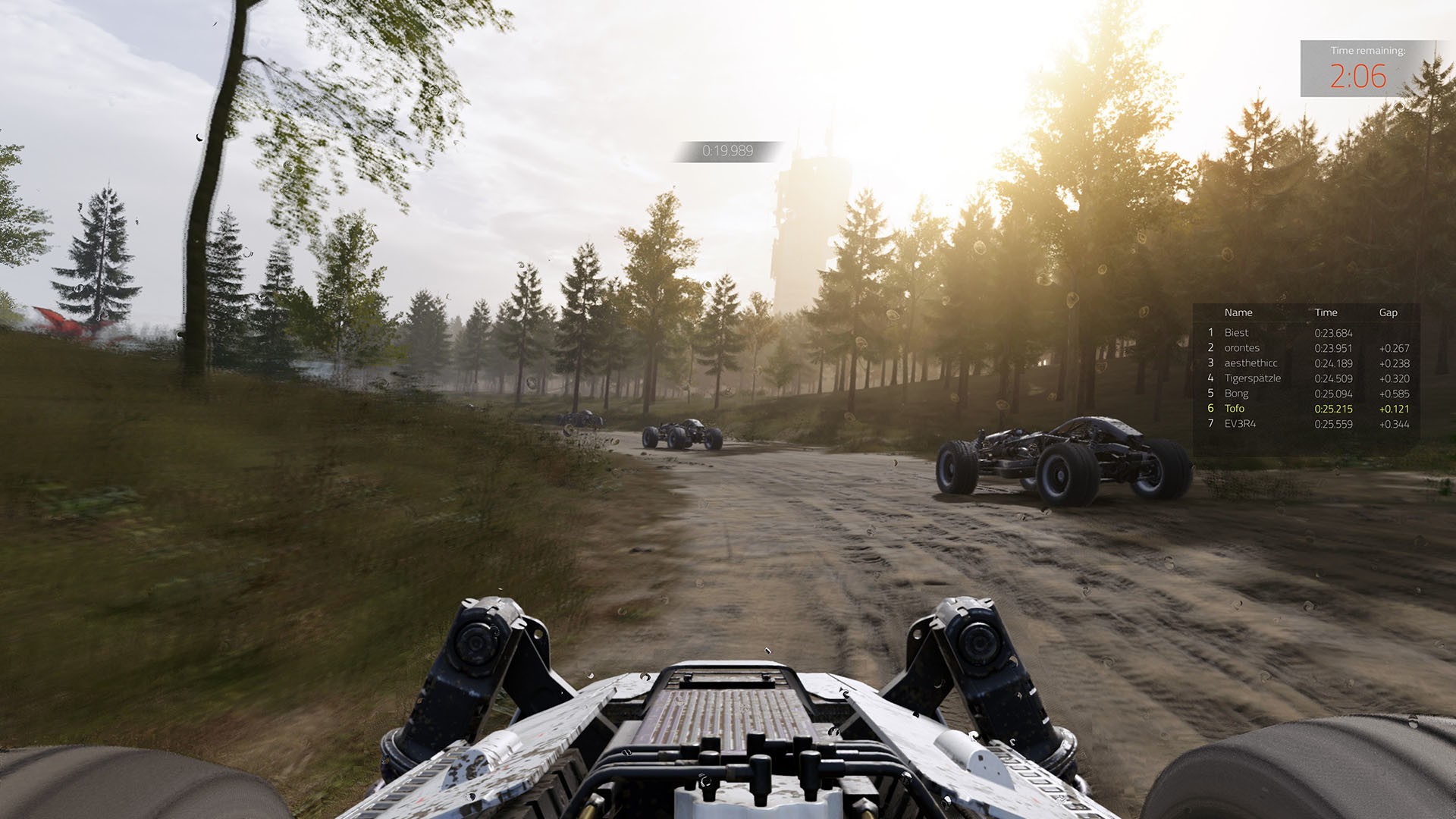 When it comes to the gameplay and the aspect of controls, there are actually some things that are worth mentioning! The game is indeed hard to master, but yet the controls are really simple. They are simple in a way that you will most likely only use the arrow keys whenever you play DRAG. And it is surprisingly difficult! I remember turning a corner for the first time and seeing my car become a pile of scrap! I really feel like learning the mechanics and mastering them is very addicting. And then we have the icing on the cake itself, the Online Mode. Nothing is more fun than crashing into the vehicles of your foes after a cheeky move! It is a perfect game to play, especially if you would like to ruin friendships! When it comes to the atmosphere of DRAG, I really like the mix between the green nature along with the futuristic elements such as the force field. The soundtrack combined with the mud flying all over the place really reminds me of the days when I used to play titles from the Motorstorm franchise. Nonetheless, DRAG really makes the experience challenging and I absolutely love it! It makes me want to play until I become the very best on most of the tracks.