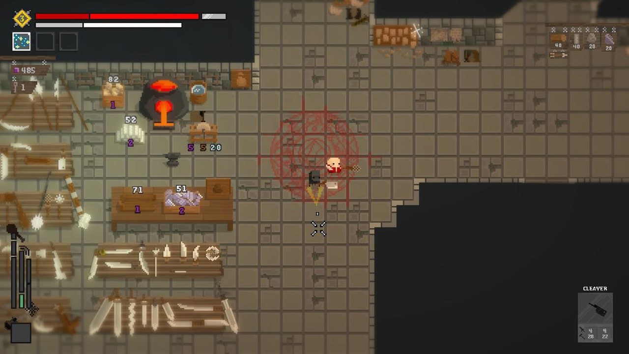 On the one hand, there’s a lot to enjoy about In Celebration of Violence. A true twin-stick top-down, you have to navigate through a hub starting world (where you can kill a bunch of people for no apparent reason) before choosing a portal to engage and begin your true quest. The combat is something meticulously crafted that can be off-putting at first. If you allow the pixel art to lull you into a sense of simplicity and repetitiveness, you’ll be murdered shortly and given no time to recover. Instead, you begin to understand that there’s a lot at stake in terms of parry, dodge and critical hit timing. You realize that different weapons have different effects on enemies, such as leaving them bleeding as they attempt to flee. Even though your character often appears as a flaming being, you aren’t immune to the ACTUAL campfires around, which, when tampered with, create raging infernos that can box you in and spell your doom if you happen to be standing in the wrong place. Item chests that float about are unlocked through donating purple “experience” which is dropped from most slain, violent foes, and you also need raw materials like wood and metal to exchange at different altars. I found out the hard way that once a particular spot was taking my overall health every time I donated, leaving me with incredible perception but also having me be vulnerable to a stiff breeze.