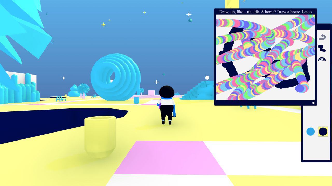 So what is Art Sqool? That’s a question that I’m still asking myself after playing for several hours and also accomplishing about half of the target “assignments.” As Frosmin, you are given projects with very subjective ideas by the disembodied Dean/Teacher, who looks like a Biblically accurate angel without being so creepy. If you want to, all you need to do is draw. That’s literally it. You drop into the game, you get your new, odd prompt (draw the back of your own head, draw music, listen to the room and draw what you hear, etc.), and go from there. You begin the game with all you technically need, which is a single-pixel style line (think the pencil tool from MS Paint) and the ability to toggle the canvas on and off. Once you finish, you return to the Dean by either entering nearly any building or, my personal favourite approach, throwing yourself over the ledge to what I prayed was death. Instead, I got evaluated on my colour, composition, approach and line work. You then get a letter grade, though you’ll be encouraged to try the assignment again if you write nothing and try to hand that in (which I did, multiple times). You respawn SOMEWHERE on campus and make another go at the next assignment, like drawing water flowing or a still life of a giant fruit somewhere on campus.