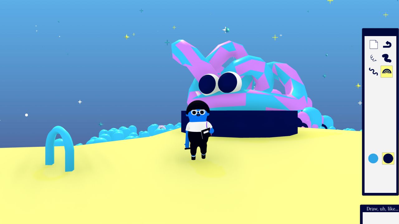 The real joy from Art Sqool comes from actually exploring the Art Sqool. Julian Glander has created a splendiferous world that’s on par with things like Hylics and Moon in terms of inventive, almost absurdist shaping. The campus is split into so many fragmented islands, each filled with round shapes, impossible sculptures and hidden secrets that are both obvious and highly hidden. Exploration will help you find brand new art tools to help you diversify your drawings, like new pens, new colours, a paint bucket tool and a stamp tool that grants wildly different stamps based on the colour you associate with it. You have a lot to see and a lot that I still haven’t totally figured out, but really would like to. I’m the only person on campus as far as I can tell, yet there’s evidence of other artists floating around, like empty theatres, well-crafted statues of odd somethings and signs. Signs in Wingdings and other off-kilter fonts. I’ve screenshotted them all and am looking forward to finding the right combination to translate and discover the meaning of them, because it’s either nothing or it’s something and it’s worth the investigations in all cases.